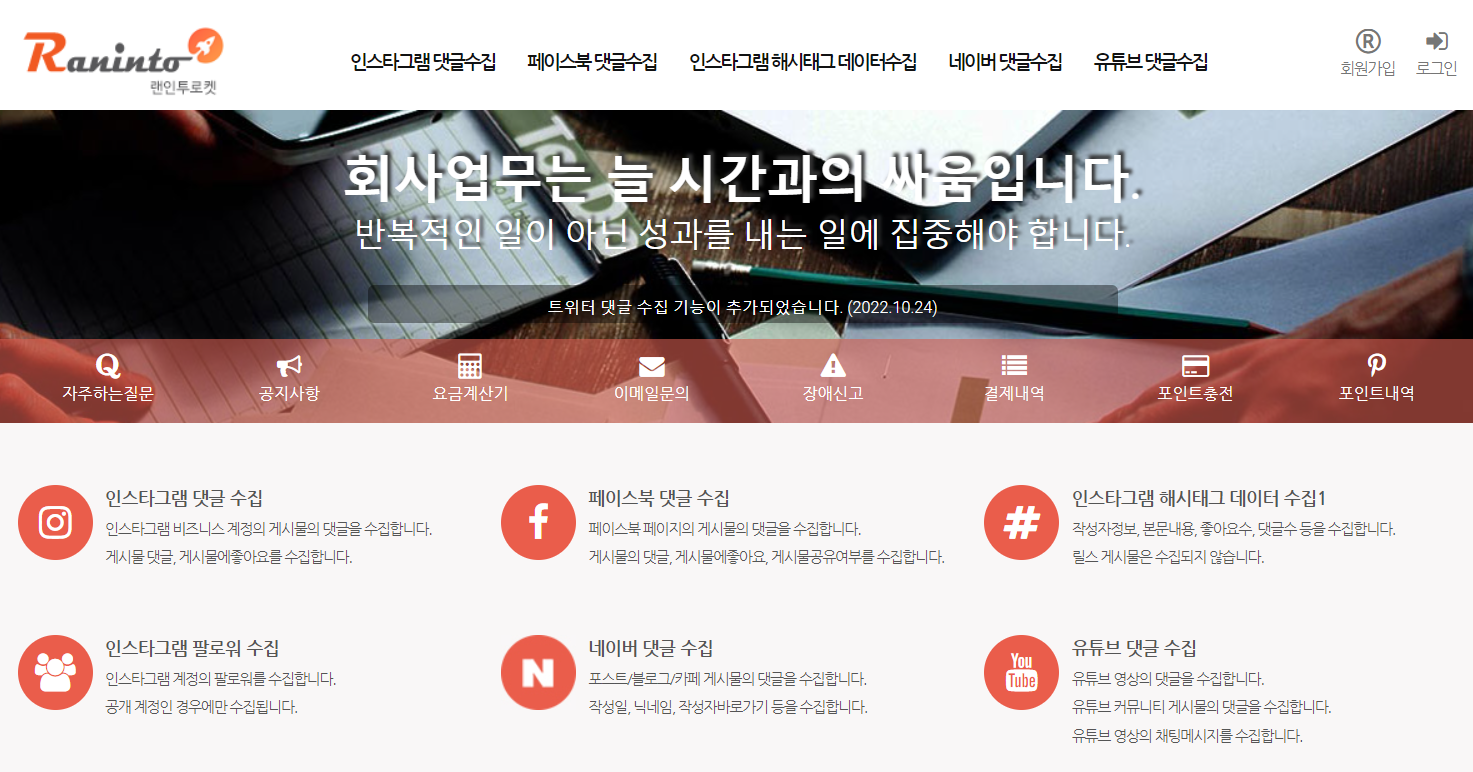 랜인투로켓은 각 채널 별(인스타그램, 블로그, 유튜브)에 달린 댓글을 수집해 주는 사이트입니다. 스파이더 킴 별도의 코딩 없이 웹상의 원하는 데이터를 수집하고 파일을 저장할 수 있습니다.